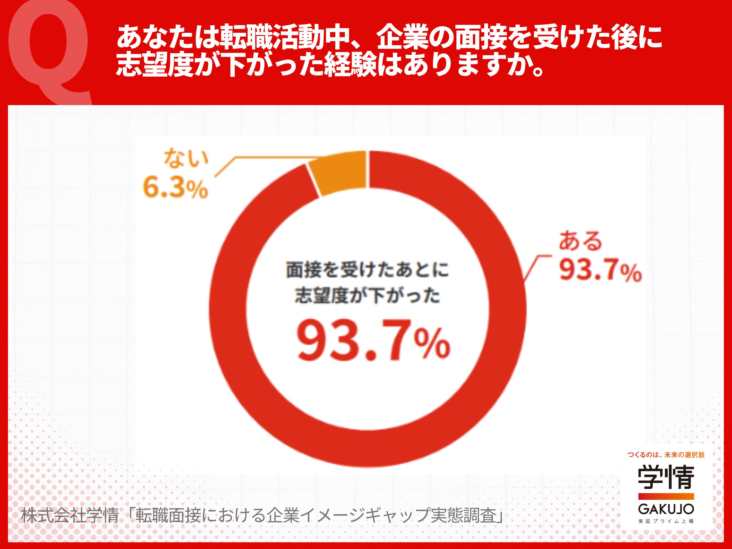 面接はそもそも企業と求職者がお互いの相性を見極める場ですが、売り手市場が続き、「企業が選ばれる場」としての側面が強まっています。学情の転職者調査によると「面接を受けた後に志望度が下がった経験がある」との回答が9割以上に上りました。
