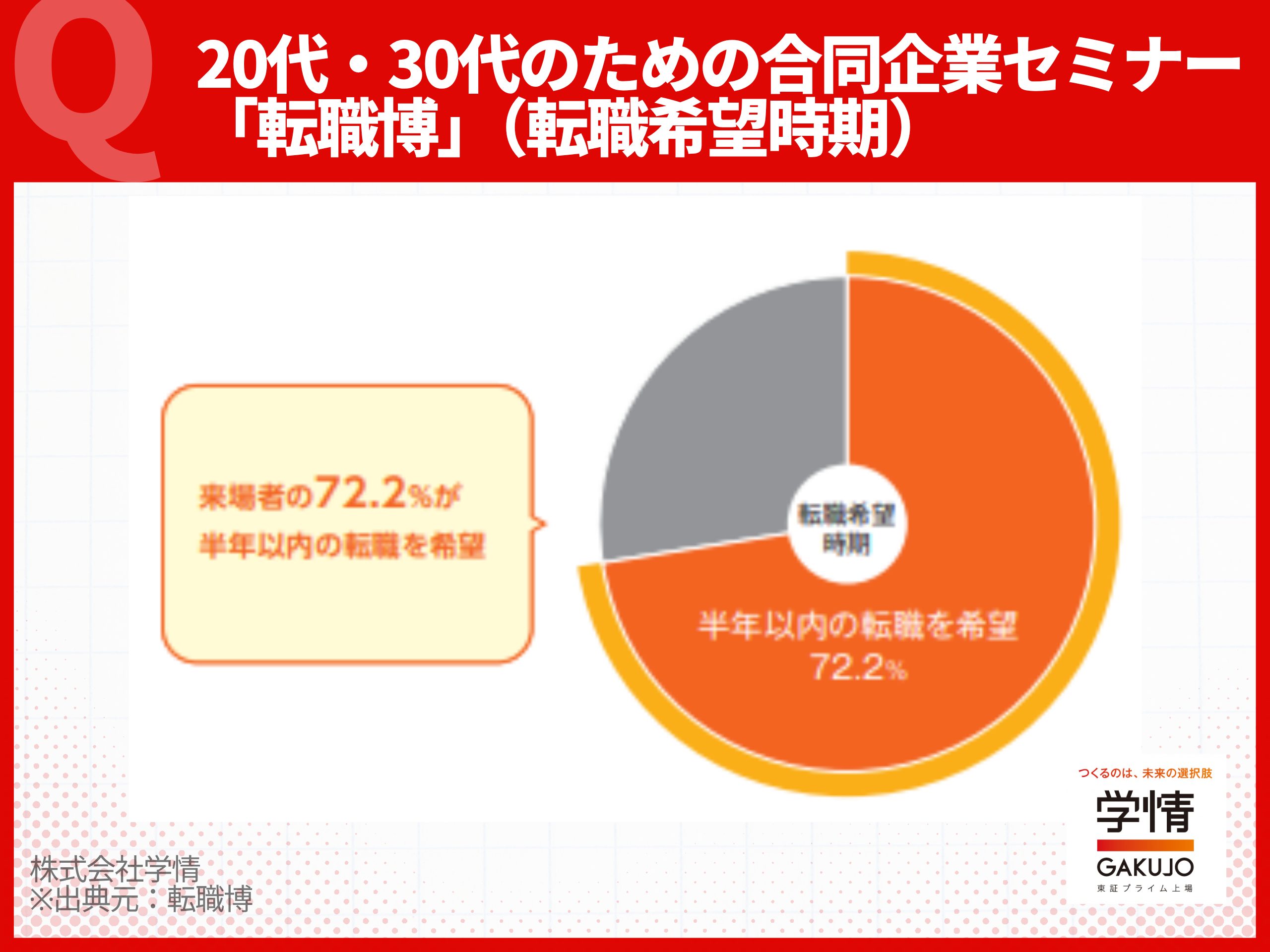 特に「転職博」のようなイベントは、転職意欲の高いアクティブな求職者と出会える場です。学情の調査によると、来場者の72.2%が「半年以内の転職を希望」しており、採用選考がスピーディーに進みやすいのが特徴です。