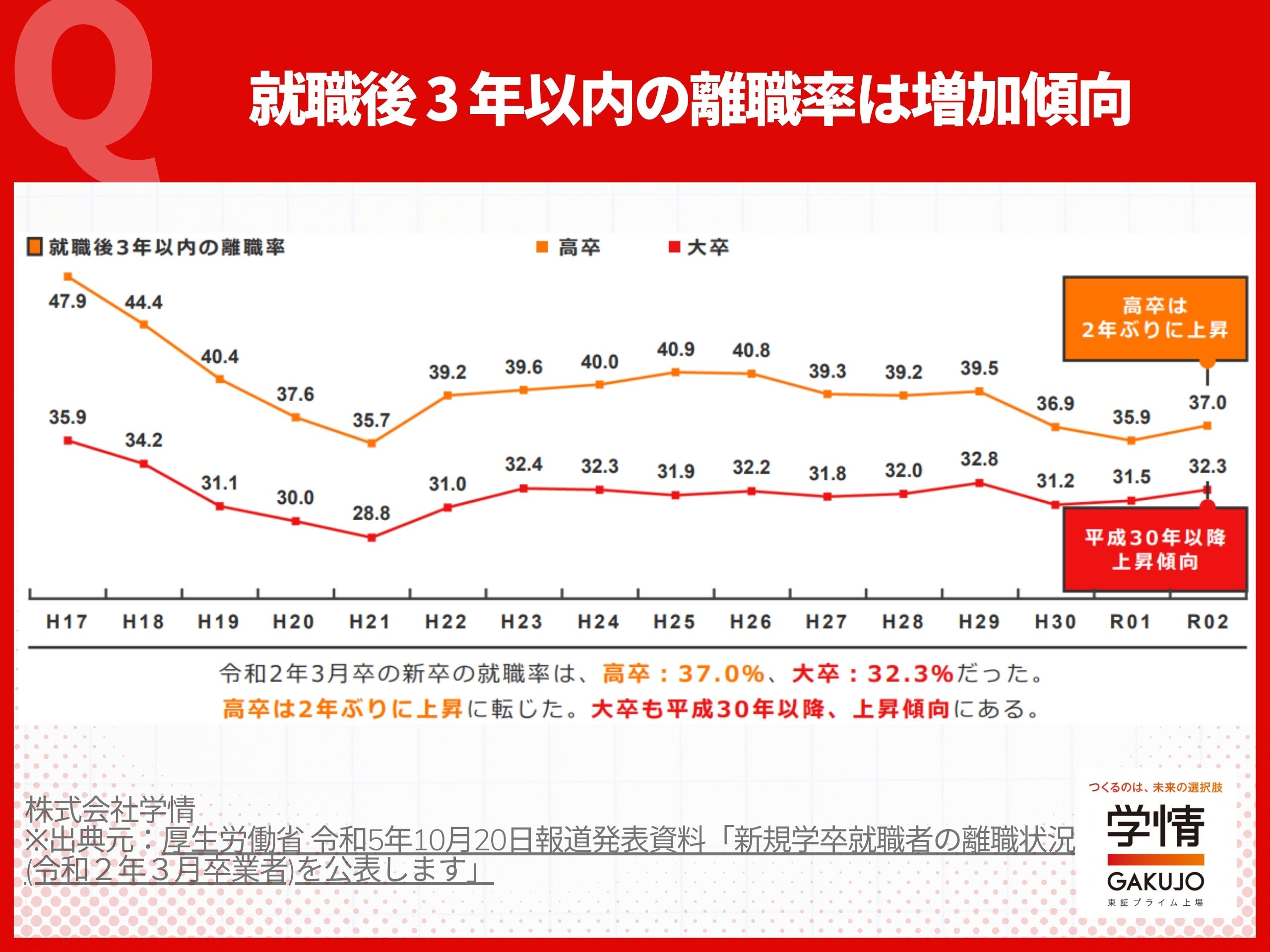 厚生労働省の調査によると、大卒新入社員の約3人に1人(32.3%)が就職後3年以内に離職しており、その割合は近年上昇傾向にあります。