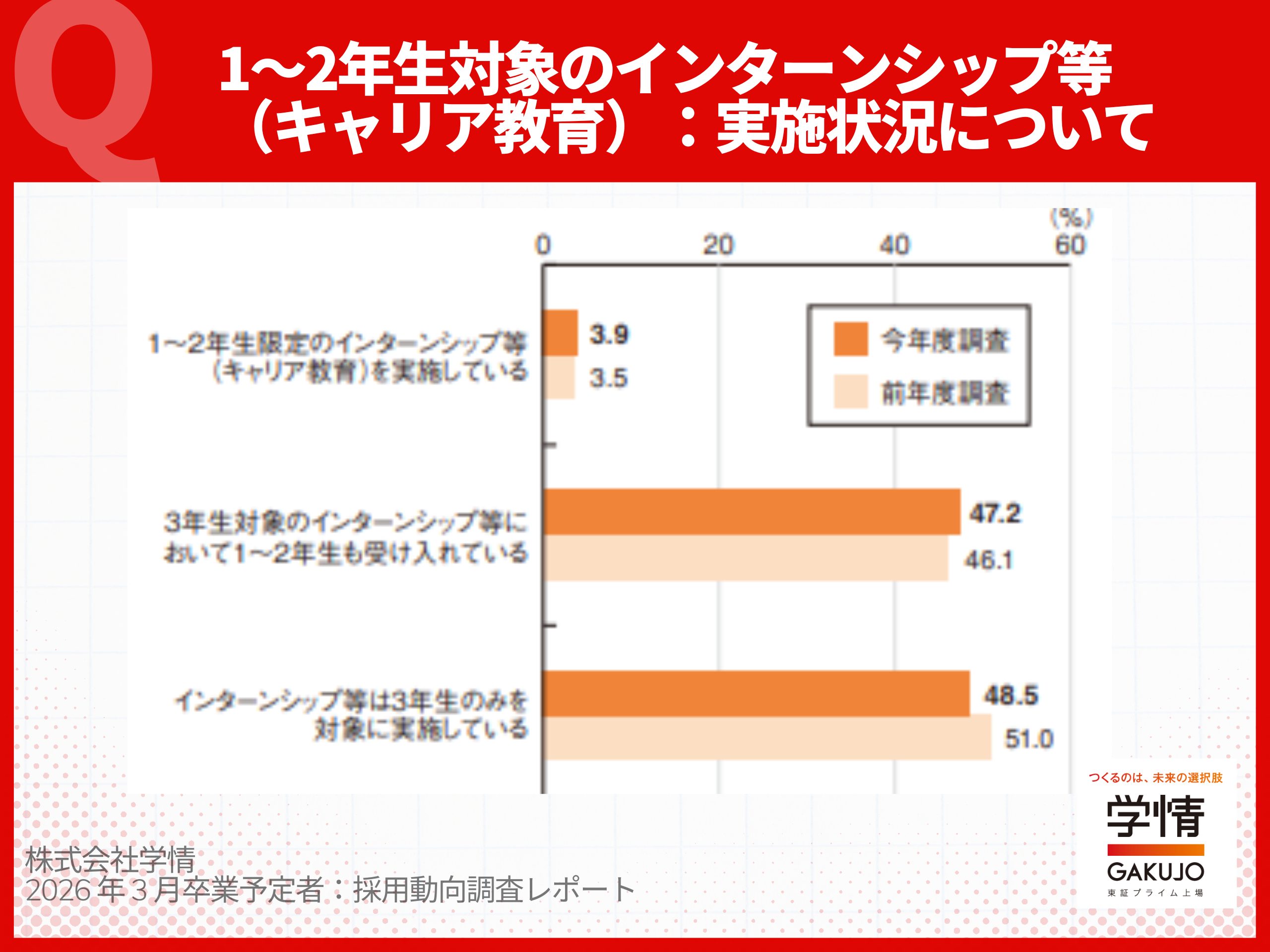 さらに注目すべきは、対象学年の早期化です。約半数(47.2%)の企業が、もともと3年生を対象としていたプログラムに1〜2年生も受け入れていると回答しており、早い段階から学生との接点を持とうとする動きが加速しています。
