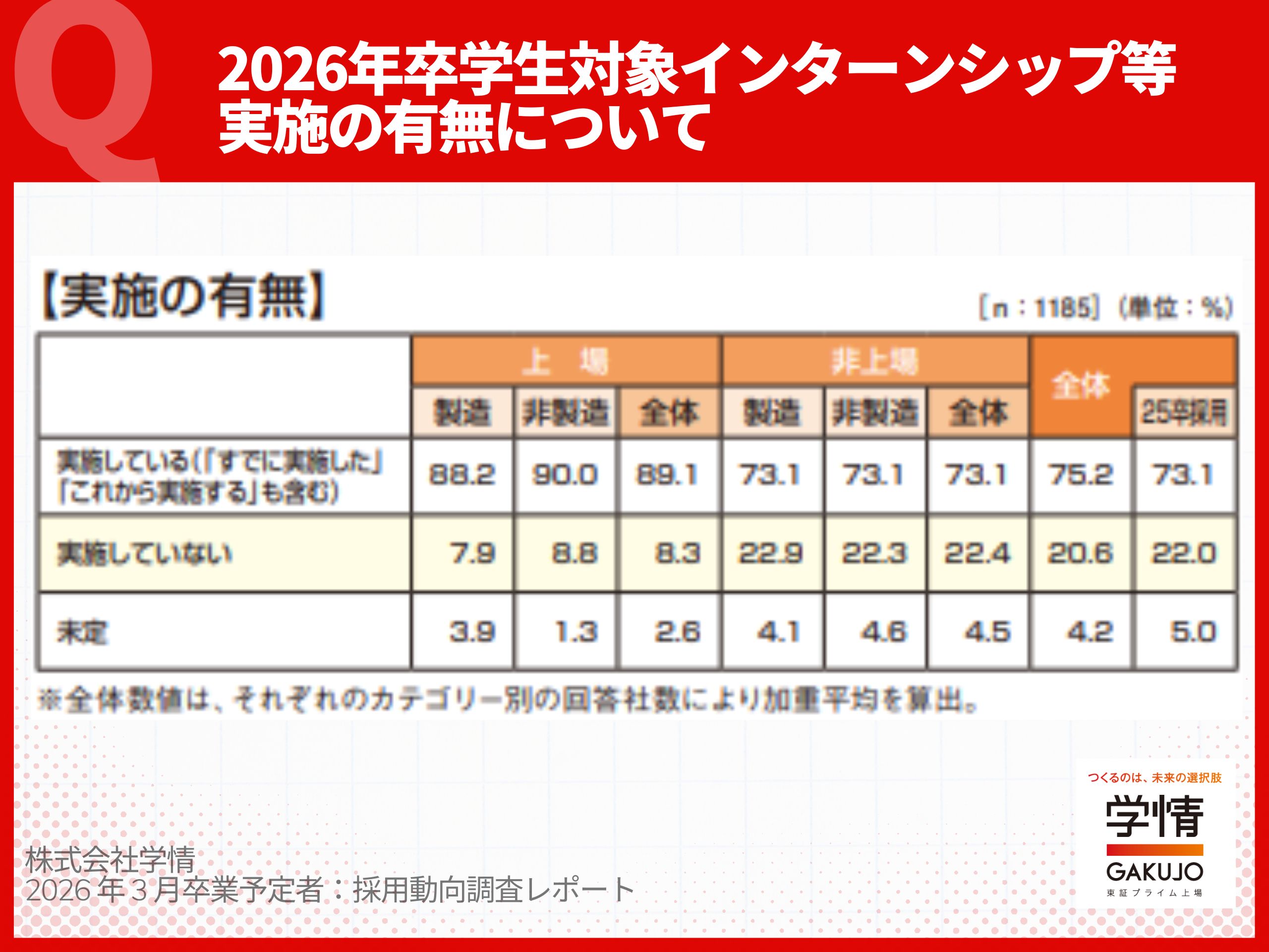 この動きは企業側にも広がっており、学情の調査では2026年卒採用において、75.2%の企業がインターンシップやオープン・カンパニーを実施しており、その割合は年々増加傾向にあります。