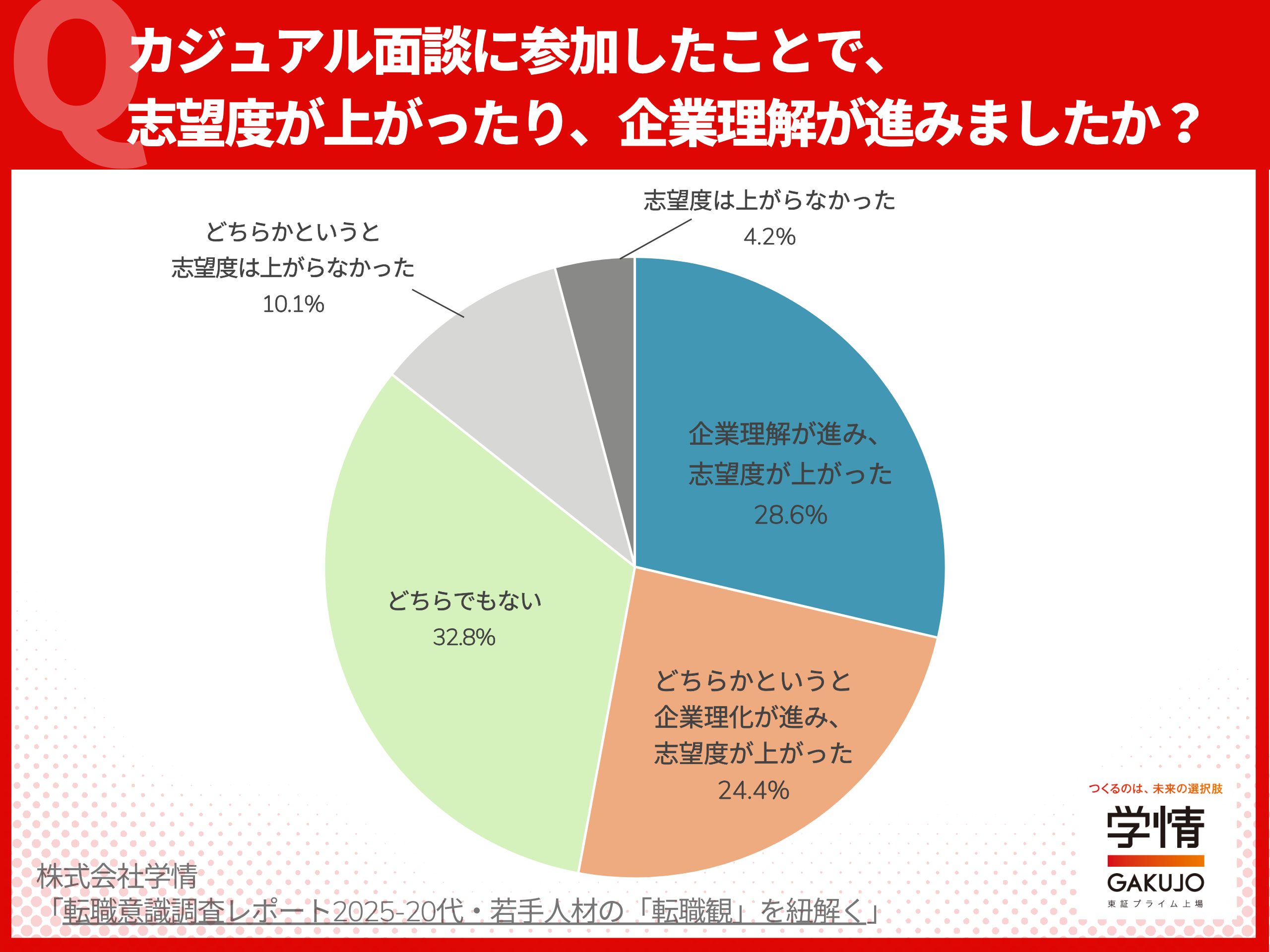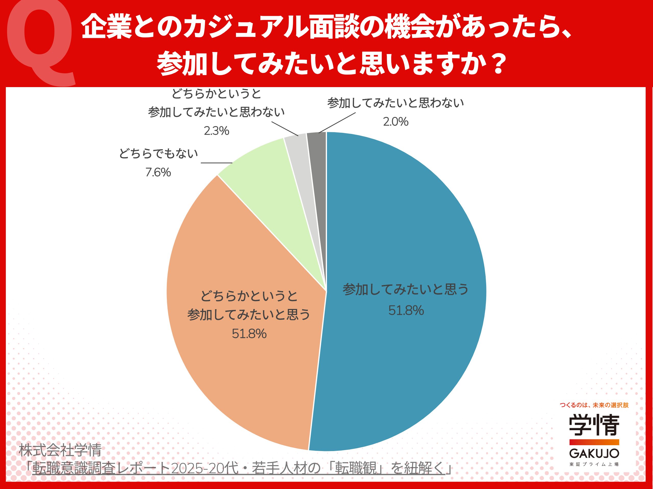 費用をかけずに応募者の志望度を上げる方法のひとつに、「カジュアル面談」があります。選考や評価を目的とせず、気軽に話して相互理解を深める面談です。学情の調査では、20代転職希望者のカジュアル面談参加意向は9割近くにのぼり、カジュアル面談に参加して志望度が上がったとの回答は過半数を占めました。