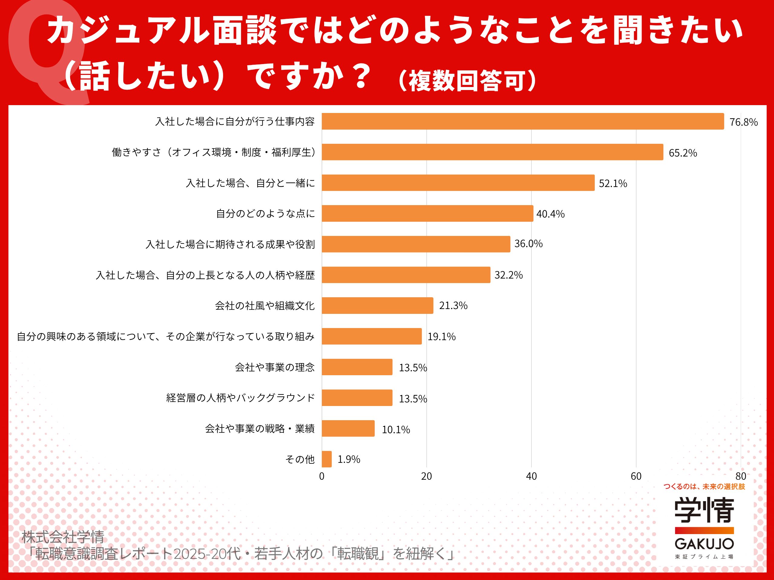 面談で聞きたいことの最多は「入社後に自分が行う仕事内容」で、次いで「働きやすさ(オフィス環境・制度・福利厚生)」「一緒に働く社員の人柄・雰囲気」と、求人票の条件よりも入社後の実態(業務・環境・人)を確認する意向が強いことが読み取れます。