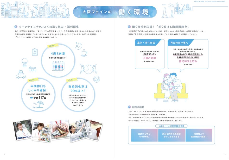一般社団法人大阪ファインは、大阪府を中心に複数の保険薬局を運営している法人です。薬学部の学生に向け、イベントなどで配布するパンフレットとして制作しました。