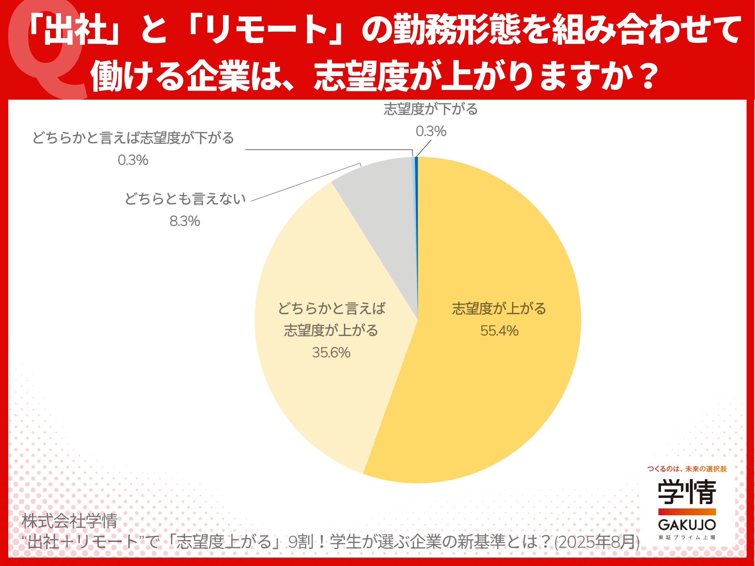 ※参考:株式会社学情「“出社+リモート”で「志望度上がる」9割!学生が選ぶ企業の新基準とは?(2025年8月)」