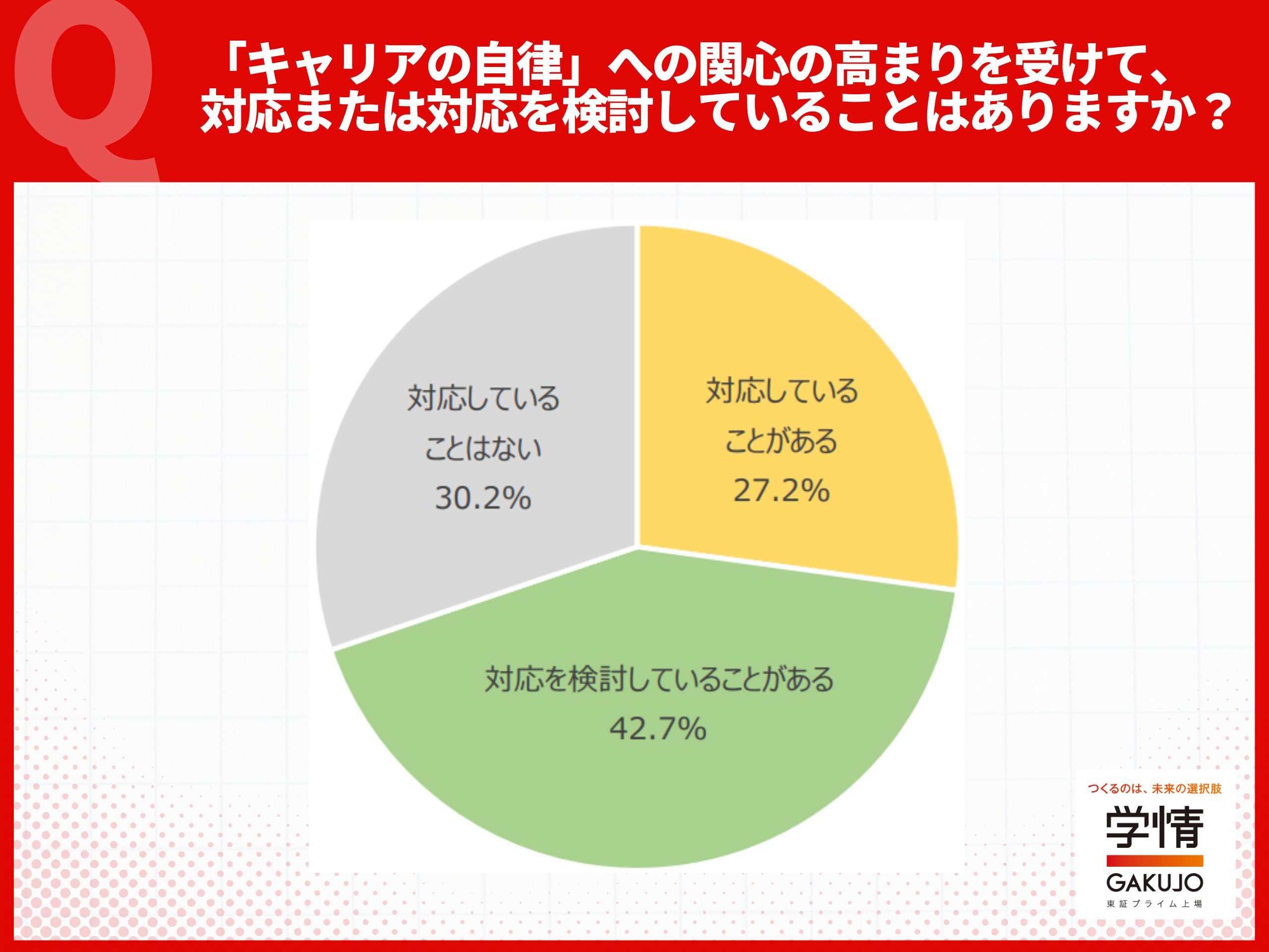 学情の調査では、社員や入社希望者の「キャリアの自律」への意識の高まりを受け、「対応していることがある」(27.2%)、または「対応を検討している」(42.7%)企業が7割を占めました。キャリア形成を個人任せにせず、企業も一定の関与が必要だという認識が広がっています。